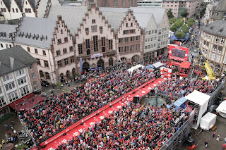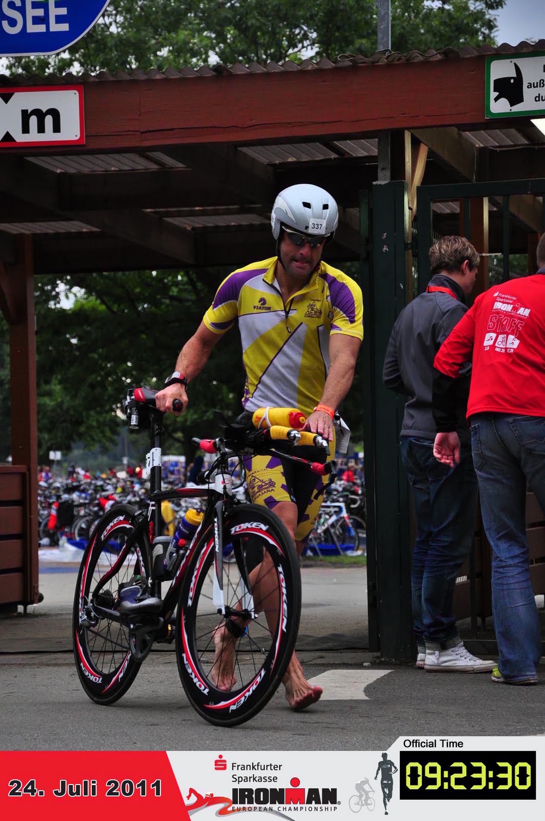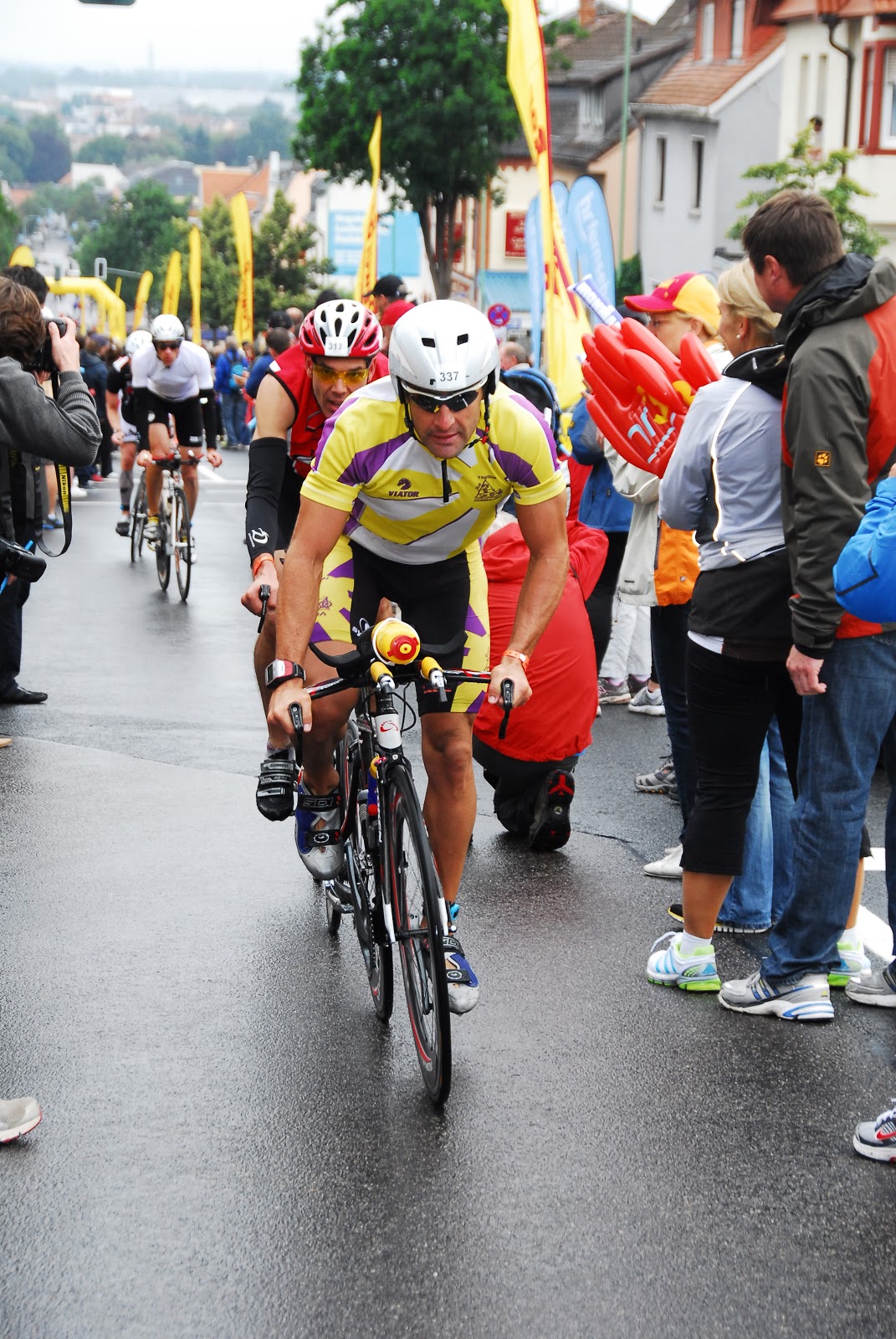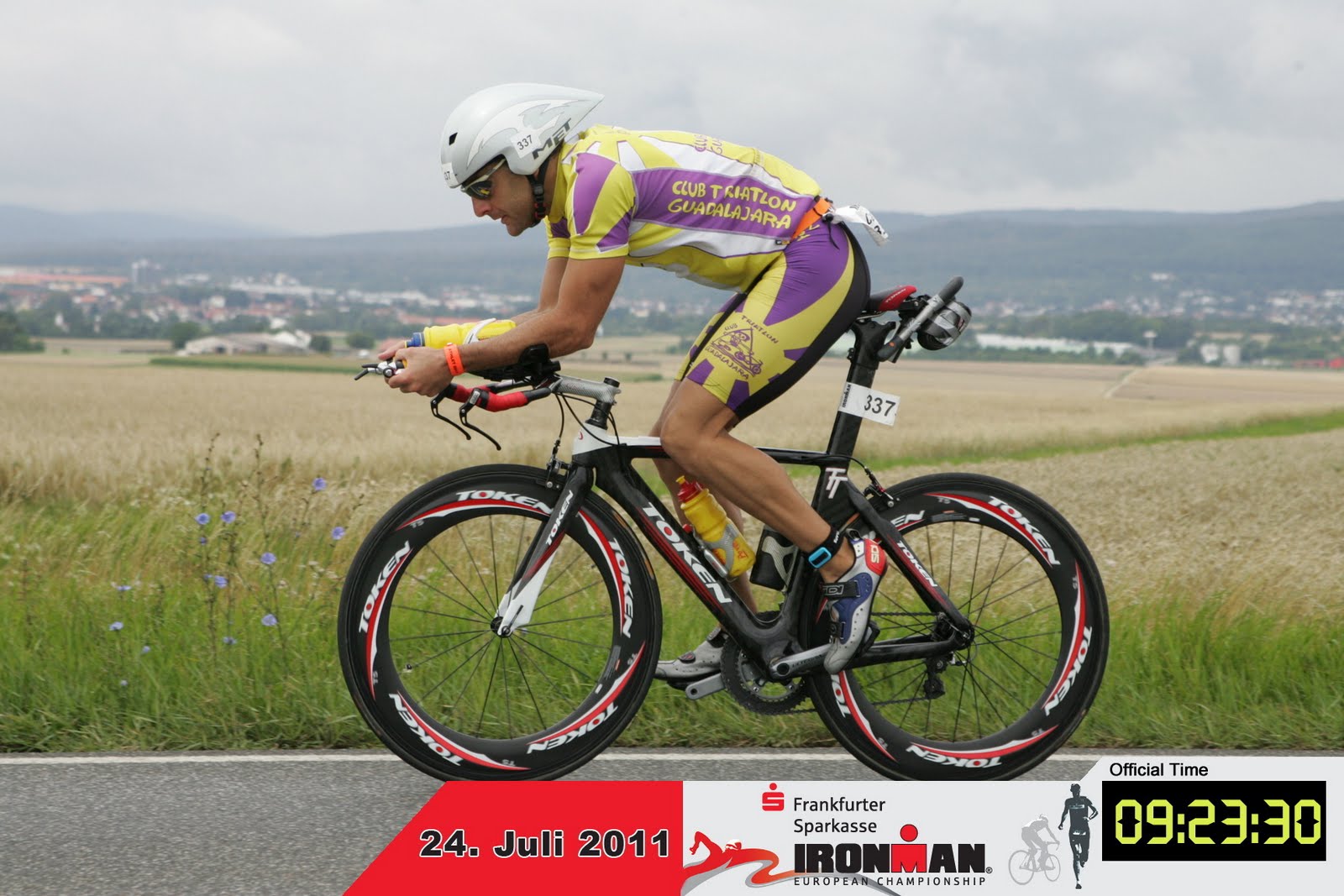 Ya en bici, el primer tramo hasta Frankfurt era muy rápido. Chispeaba algo pero no molestaba. El Garmin marcaba 39km/h de media. Apartir de aquí dos vueltas de 85 km cada una. La teoría decía que tenia que hacer menos de 5 horas en la bici para luego tener margen en la maratón y conseguir la plaza para Hawai. Y la teoría decía que el circuito era accesible para sacar una media alta, incluso mas que en Austria, donde rodé los 180km a mas de 37 km/h de media.