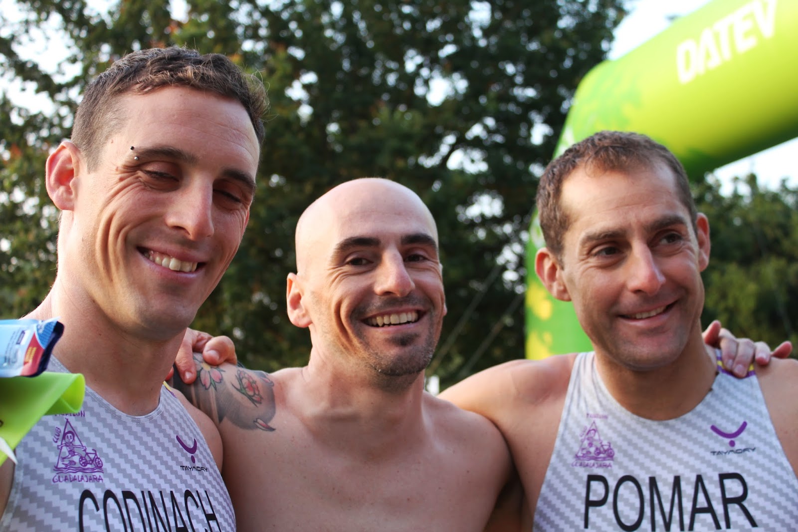 Me temo lo peor, seguro que en cuanto salga del agua vomito y no se yo después que ... Llego a la alfombra de salida y en cuento me pongo de pie se me pasa todo, me despejo y me encuentro perfecto. Miro el crono y marca 56’ y poco. Transición muy rápida. Según voy a por la bici oigo a Maria animar a Codi, eso quiere decir que le tengo ahí.