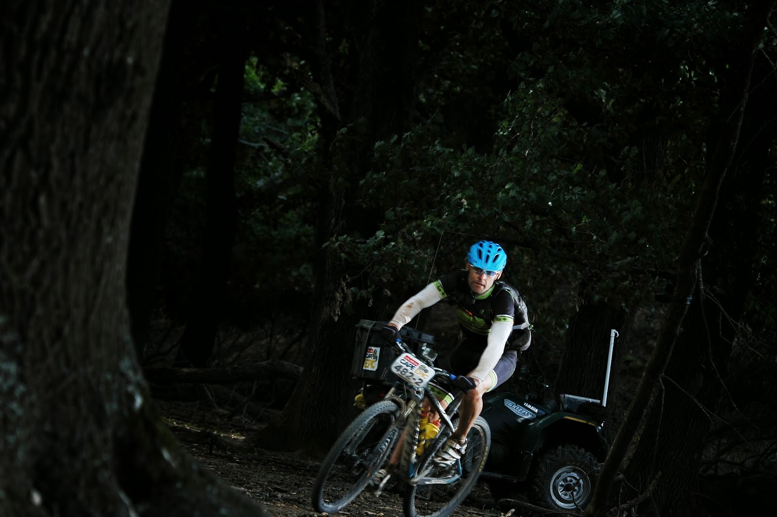 Kilómetro 50, primer avituallamiento, parada rápida y continuamos. A partir de aquí comenzará nuestra odisea del día. A escasos tres kilómetros de la parada noto baja la rueda trasera. No le doy importancia, algún pincho que no ha sellado bien o un pellizco que ha hecho perder presión. Paro, hincho rápido y continuo, pero a los pocos metros otra vez igual. La cubierta tiene una pequeña raja y el líquido no la puede sellar. Mala suerte, hay que arreglar, es algo normal en estas carreras. Montamos una cámara antipinchazos y listo. Ni Iván, ni sobretodo yo, somos unos manitas así que perdemos casi 15 minutos en la operación… “No problem”… Unos 5km mas adelante, en un bajada rapidísima entre rocas y piedras afiladas como cuchillos, con multitud de zanjas y saltos, noto un llantazo en la rueda trasera y en segundos el neumático está en el suelo… PROBLEMON!!!. Solo llevamos cámaras sin liquido y la zona es muy propensa a pinchar. Encima de las dos que llevamos una no coje aire. Pasamos un rato jodido, empiezo a temer en no acabar la etapa. El siguiente avituallamiento está a mas de 30 kilómetros. La cosa no pinta bien. Montamos la única cámara que tenemos y emprendemos marcha. La situación es delicada: rueda trasera con neumático rajado y cámara sin liquido, todas las papeletas para volver a pinchar.