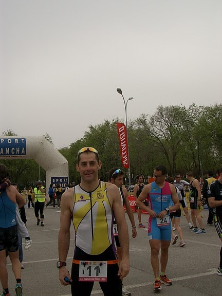 Transición tranquila y segura, y a por la bici. Las primeras sensaciones en la bici son muy buenas. Buen ritmo y las piernas responden. En los primeros kilómetros remonto posiciones, aunque alguno también me pasa. En la zona de repechos intento mantener el nivel de esfuerzo y la cosa sigue bien. A partir del km25-30 la cosa es muy aburrida. Es lo que tiene salir en la primera salida y en categoría élite, las fuerzas están bastante igualadas y haces casi todo este sector solo manteniendo distancias. En la parte la bajada me quedo sin desarrollo. Bajamos por una autopista en la que sin dar pedales te pones a 70km/h y el 50x11 no dan para pedalear (ya tengo la bici en al taller para solventar este problema, 53x11 es la solución). Los últimos 25km se me hacen largos. Viento en contra, y un llano interminable. Aquí es donde noto que me aún me faltan una par de puntos en bici y es que las sensaciones no son todavía las de otros años. Me cuesta mantenerme acoplado todo el rato y de vez en cuando tengo que soltar. Ahora es lo que hay, lo sabia así que no me preocupa, incluso al final me encontré mejor de lo que esperaba. Al final un tiempo de