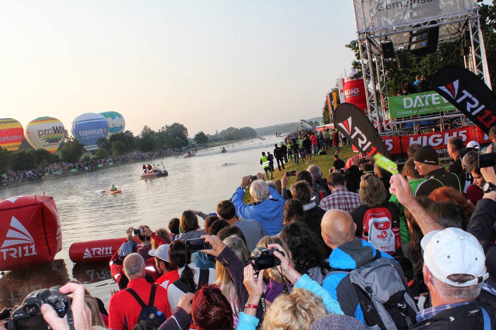 tengo que apretar mas en bici para tener margen en la carrera … si no cumplo en natación ni en bici, tengo que correr mucho en la maratón …” cálculos y mas cálculos … Así hasta el Domingo a las 6:25 a.m que te metes en el Main-Donau-Canal. Puentes y las orillas llenos de gente, Maria, mis padres y Ainoa ondeando la bandera de España, últimos ánimos de Dani Luna que sale 10min mas tarde, Codi a mi lado, pensando los dos en el tiempo que nos hemos marcado. En es momento solo intentas quitarte presión, disfrutar y ver como van transcurriendo los acontecimientos.