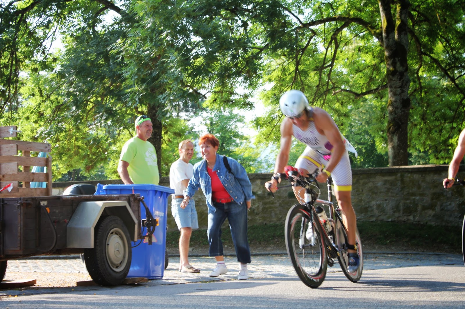 Los primeros kilómetros de la bici se hacen con mucha gente, pero poco a poco se van disgregando y ya vas casi solo. El circuito es rápido, pero duro. La velocidad es alta pero a base de apretar las bielas. Corre una ligera brisa que cuándo te pega de frente molesta y baja la velocidad. Hay tramos por los que ruedas por encima de 40-45km/h pero otros donde es difícil mantener 32-33km/h. Los cálculos de tiempo en bici van a ir muy justos. Durante la primera vuelta vas pensando en la subida de Solarer berg. Las fotos que hemos visto son espectaculares, los triatletas pasando por un pasillo de gente. Km 70, entras en el pueblo de Hilpoltstein, giras a la derecha y … MAAAAAAAAADRE MIA .. ¿Y por donde paso yo? … a 100m tienes una muralla de gente, sin un metro por donde meterte… ¿Se quitarán? … efectivamente la gente se va apartando 2 metros antes de que tú llegues a ellos… HAY MILES DE PERSONAS… la subida son a penas 500 metros… el griterío, la música es ensordecedora… podría estar describiéndola durante párrafos interminables, pero siempre me quedaría corto. IMPRESIONANTE.
